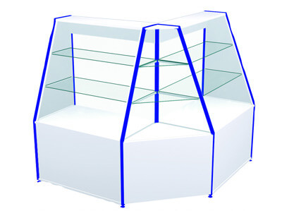 Прилавок ПС3 металлический с фронтальным наклонным остеклением, с двумя стеклянными полками и запасником с металлической полкой.